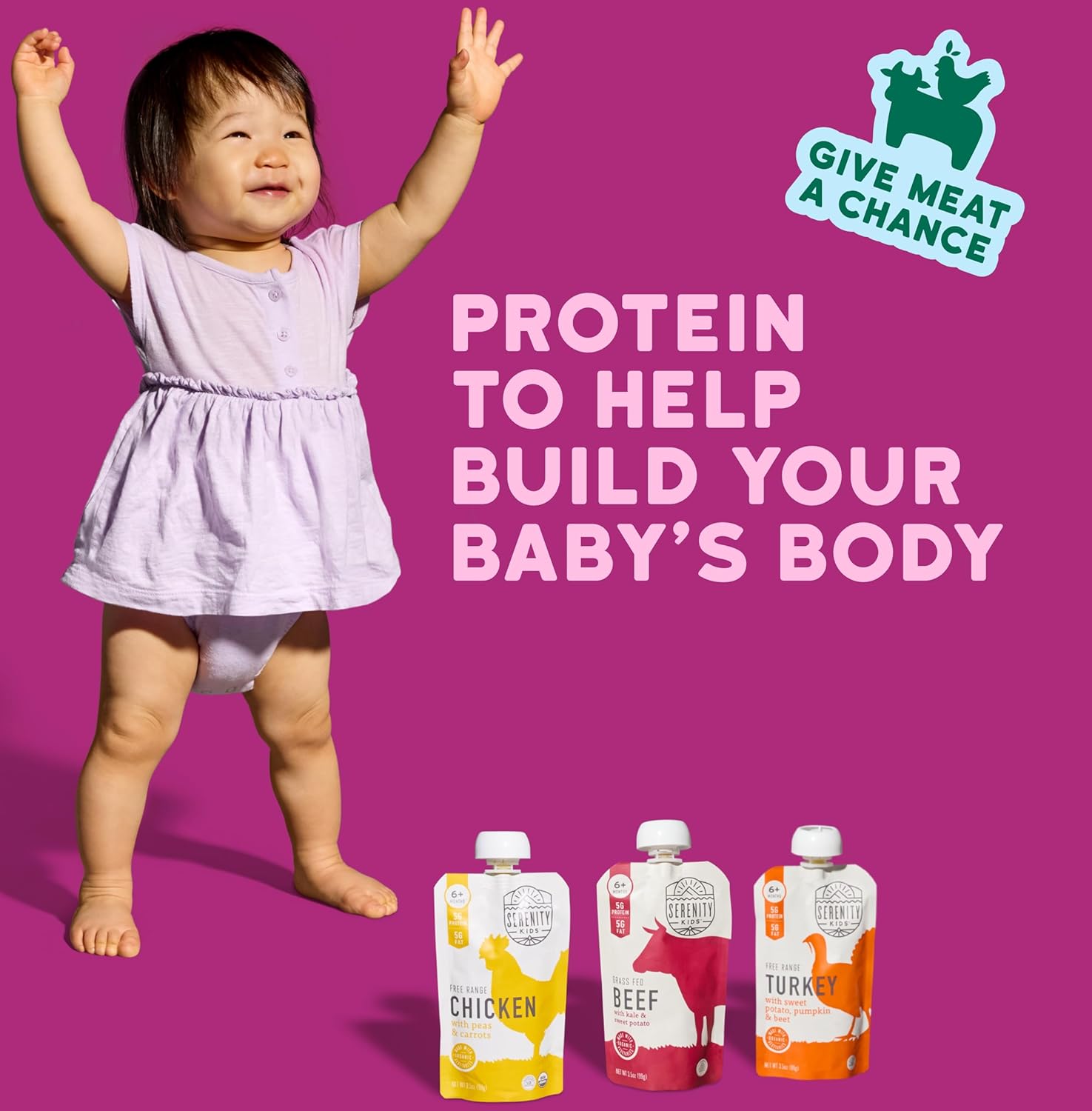 - WHEN BABIES CAN EAT MEAT: The USDA says babies can start digesting meat at about 6 months. Our baby food meat pouches introduce essential nutrients early on, making them ideal as the first complementary food. The Serenity Kids pouches offer nutritious baby food with meat and veggies