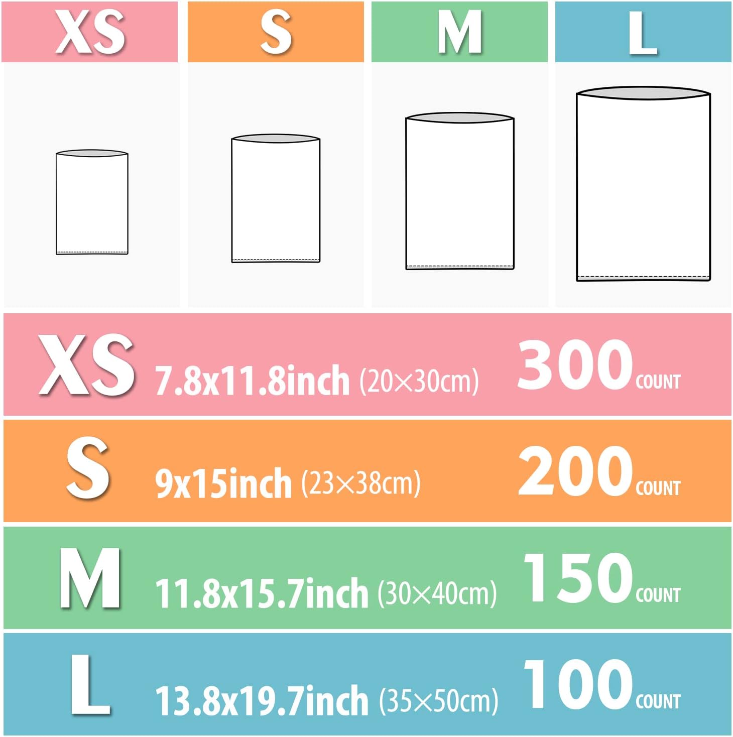 - [Multiple Specifications] Four sizes : XS(7.8" x 11.8" /300 Counts) , S(9" x 15" /200 Counts) , M(11.8" x 15.7" /150 Counts) , L(13.8" x 19.7" /100 Counts). Large capacity, you can use it for a long time.You can choose the most suitable size according to the size of the baby's diaper.