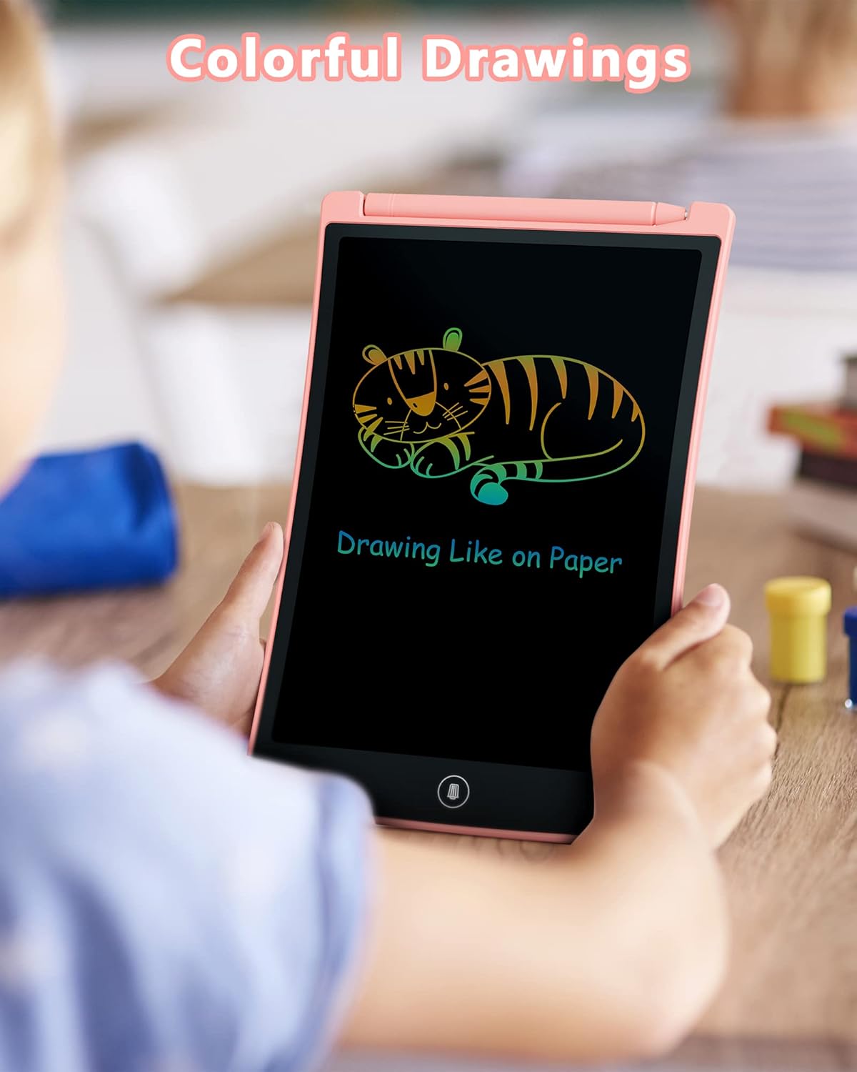 - 8.5 Inch Colorful Lcd writing Tablet: You can write on the LCD with stylus or anything else that creates pressure. As sleek as writing on paper. You can draw a very thin line and a thicker line to make things look different. With erase button on the front and lock switch. You can draw and erase easily by pressing the button on the front of the board. The pen fits snug on top of tablet and it will not come loose.