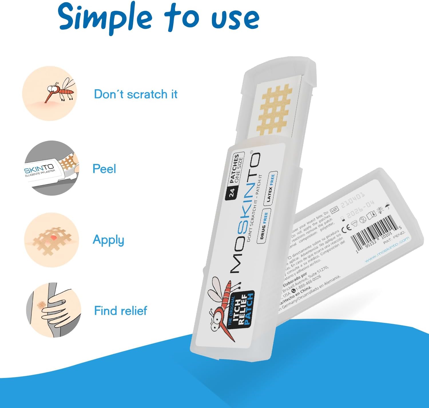 - Drug-Free, Effective, & Long-Lasting: Our innovative solution provides the best and easiest way to achieve quick and lasting relief; As a latex-free and waterproof solution, you can swim or shower with Moksinto, knowing our Itch-Relief Patch continues to provide relief for up to 4-11 days; Skip the hassle of creams and opt for a portable, and comfortable solution that Moskinto provides
