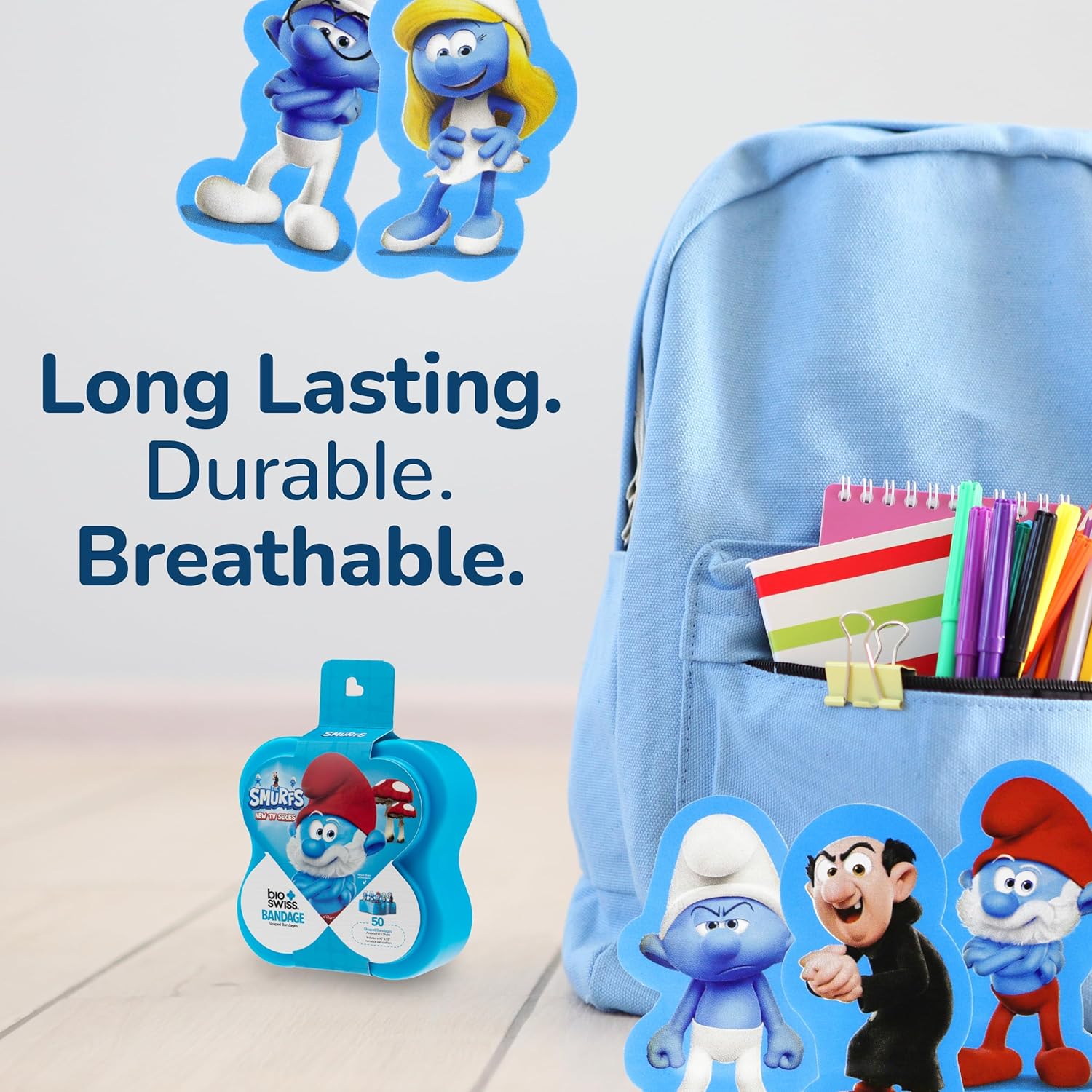 BioSwiss Bandages, The Smurfs in 3D Shaped Self Adhesive Bandage, Latex Free Sterile Wound Care, Fun First Aid Kit Supplies for Kids and Adults, 50 Count Plastic Case