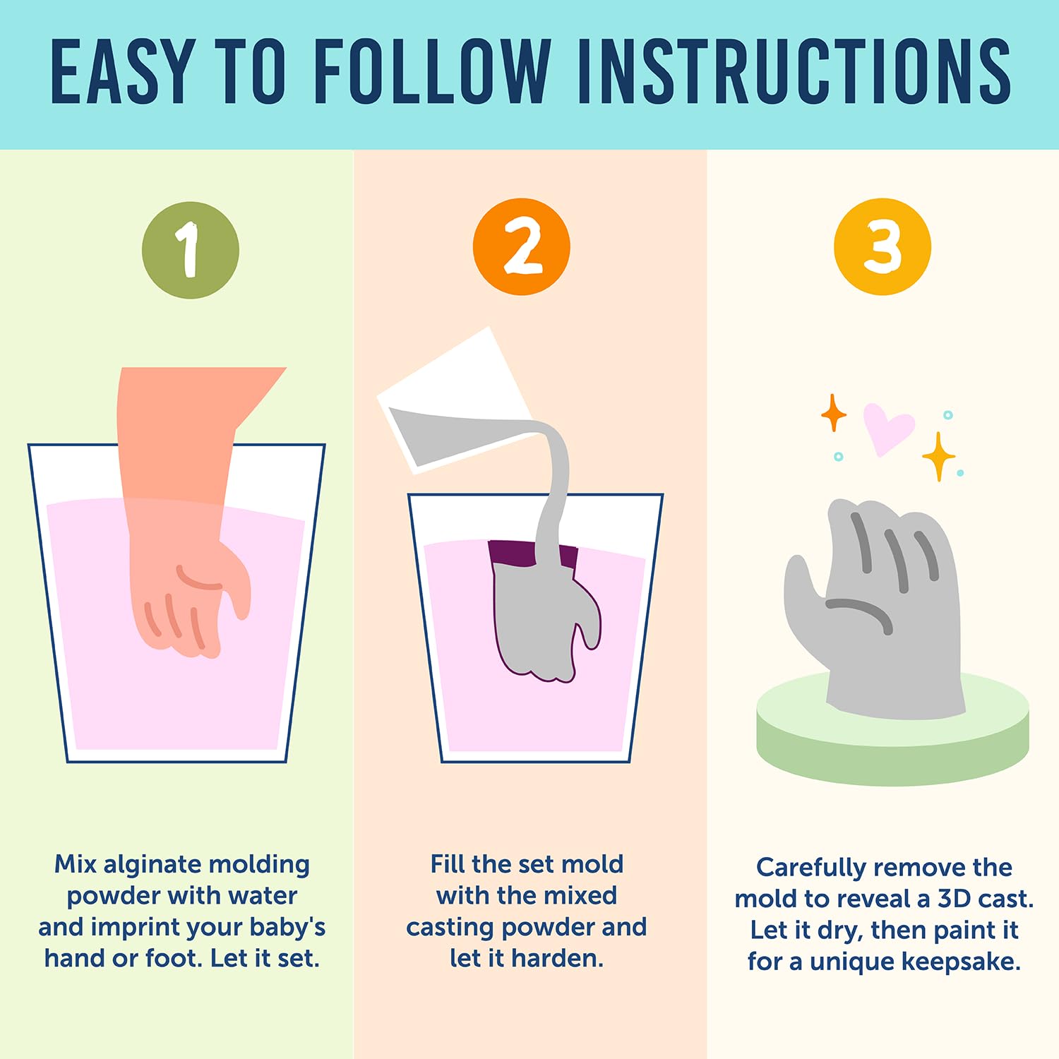 - Mess Free Casting Process: Mix the alginate molding powder with water to form a detailed mold of your baby's hand or foot. Fill with mixed casting powder, allow it to harden, and reveal a 3D cast ready for personalization with paint