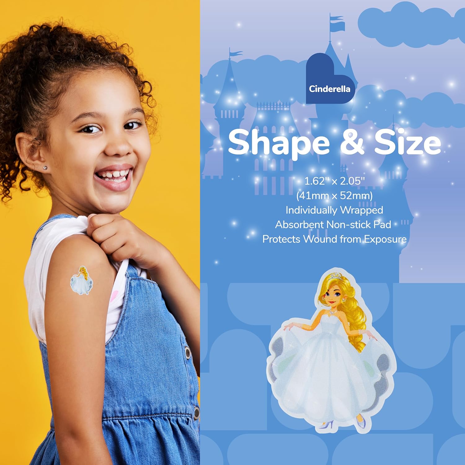 - CINDERELLA BANDAGES: This 24 piece pack of Cinderella bandages feature a fun Cinderella shape, and is great for putting a smile on kids' faces while protecting wounds such as cuts, scrapes, and burns; sticky bandages come in a cute cardboard box and are perfect for kids and adults alike, and also for school nurses and pediatric doctors