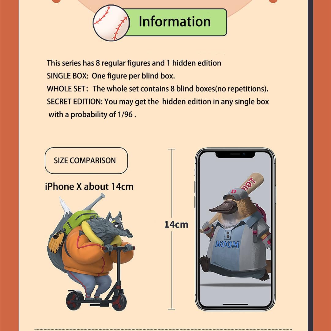 - Animal baseball team figures: It is a collectible Figure. This series has 8 regular figures and 1 hidden edition to collect.