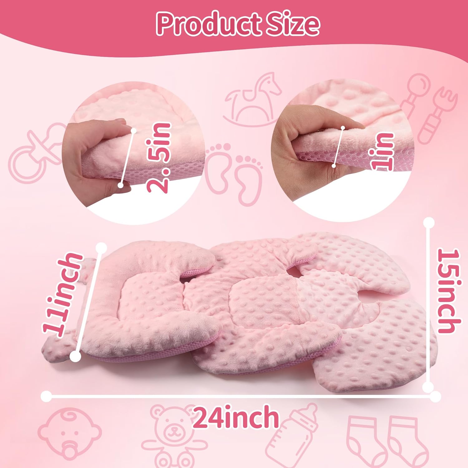 - Two-Sided Use: Infant carseat head body support features a reversible design. 3D Minnky Dot on the front is soft and comfortable. 3D air mesh on the back is breathable and absorbs sweat. It makes your baby feel comfortable.