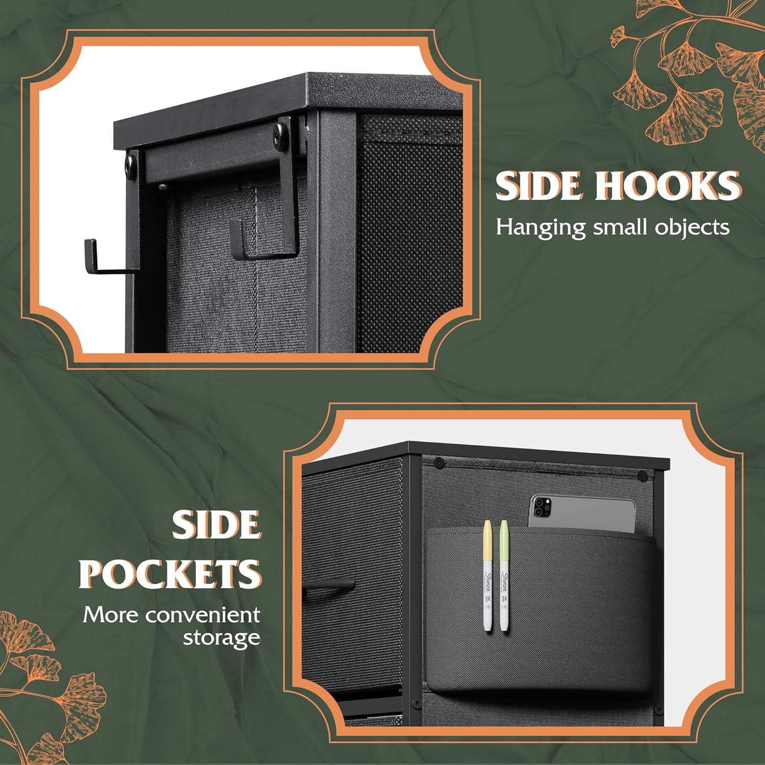 - â ăUpgraded Side Pockets and HooksăWe cleverly integrated four side pockets and two side hooks in the upgraded version. The side pockets not only provide additional storage space for lightweight items, making storage more organized; The side hook design makes it easy for you to hang umbrellas, shopping bags, or other small items, making your life more convenient.
