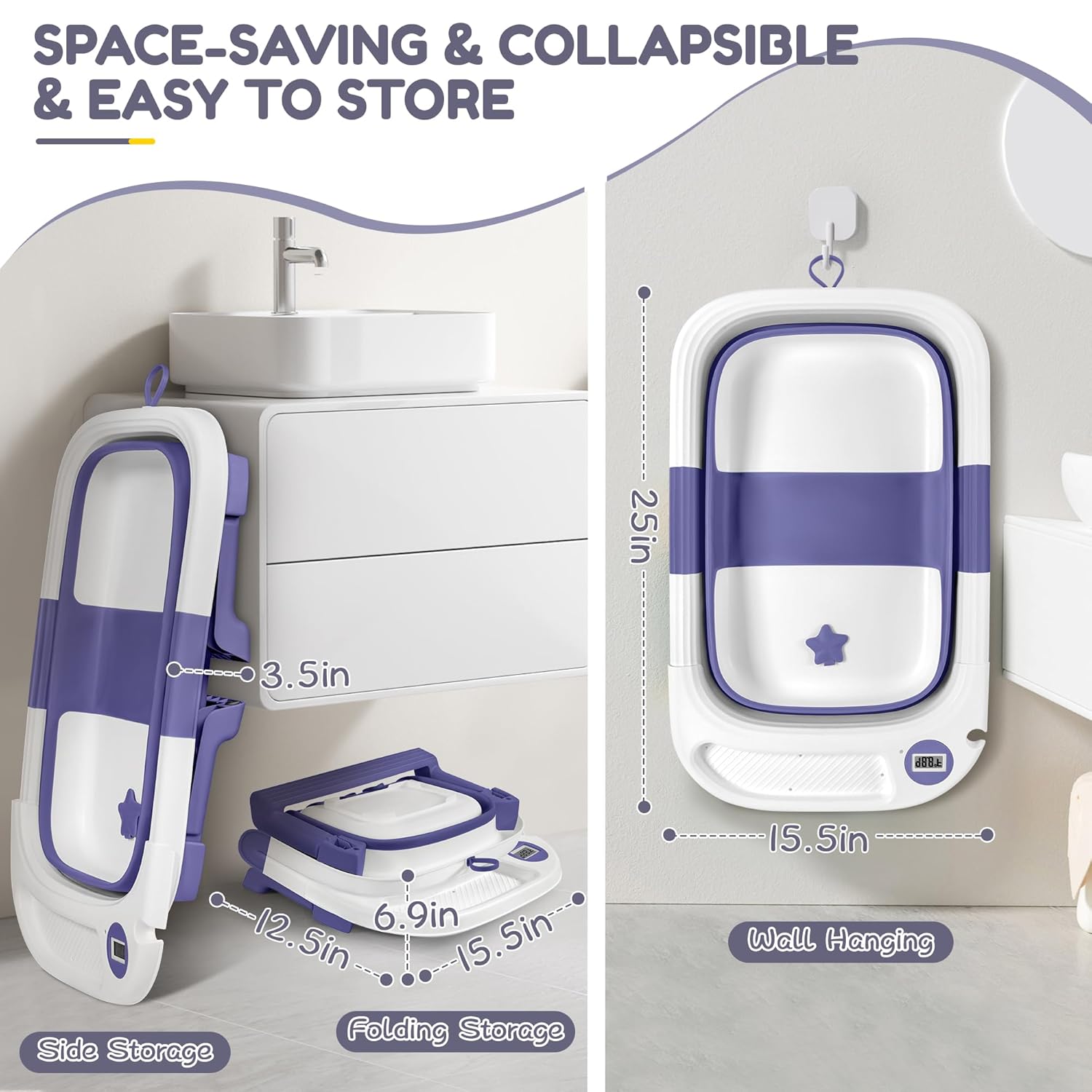 - COLLAPSIBLE & SPACE-SAVING DESIGN: This baby bathtub easily folds into a compact square, with a thickness of less than 4 inches. Perfect for storage in the bathroom or car trunk, making it an ideal companion for home and travel.