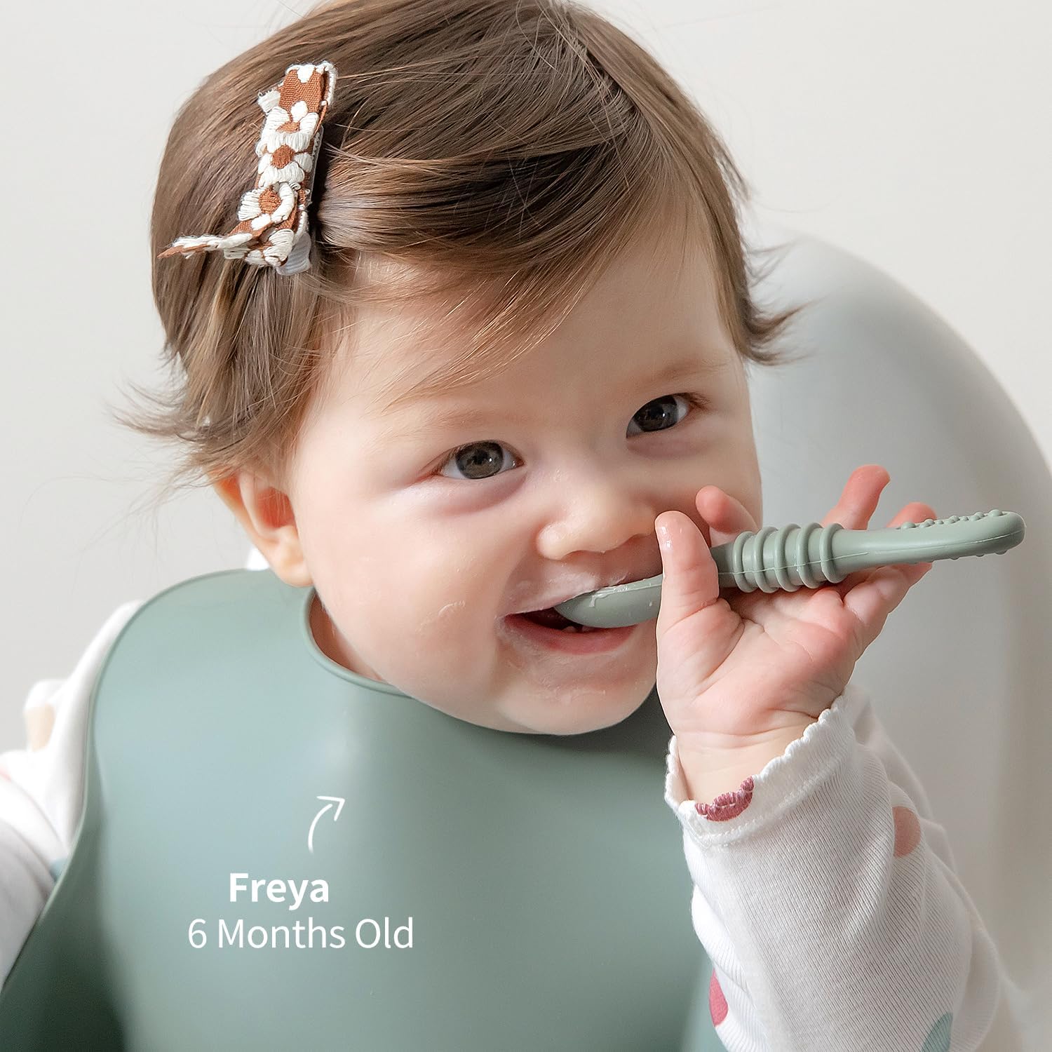 - Double-Ended Spoon - one end for scooping and the other for dipping. The handle is nicely textured with multiple bumps and ridges for soothing sore gums while ensuring a firm grip in little hands, too.