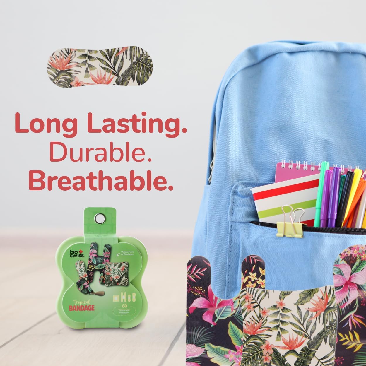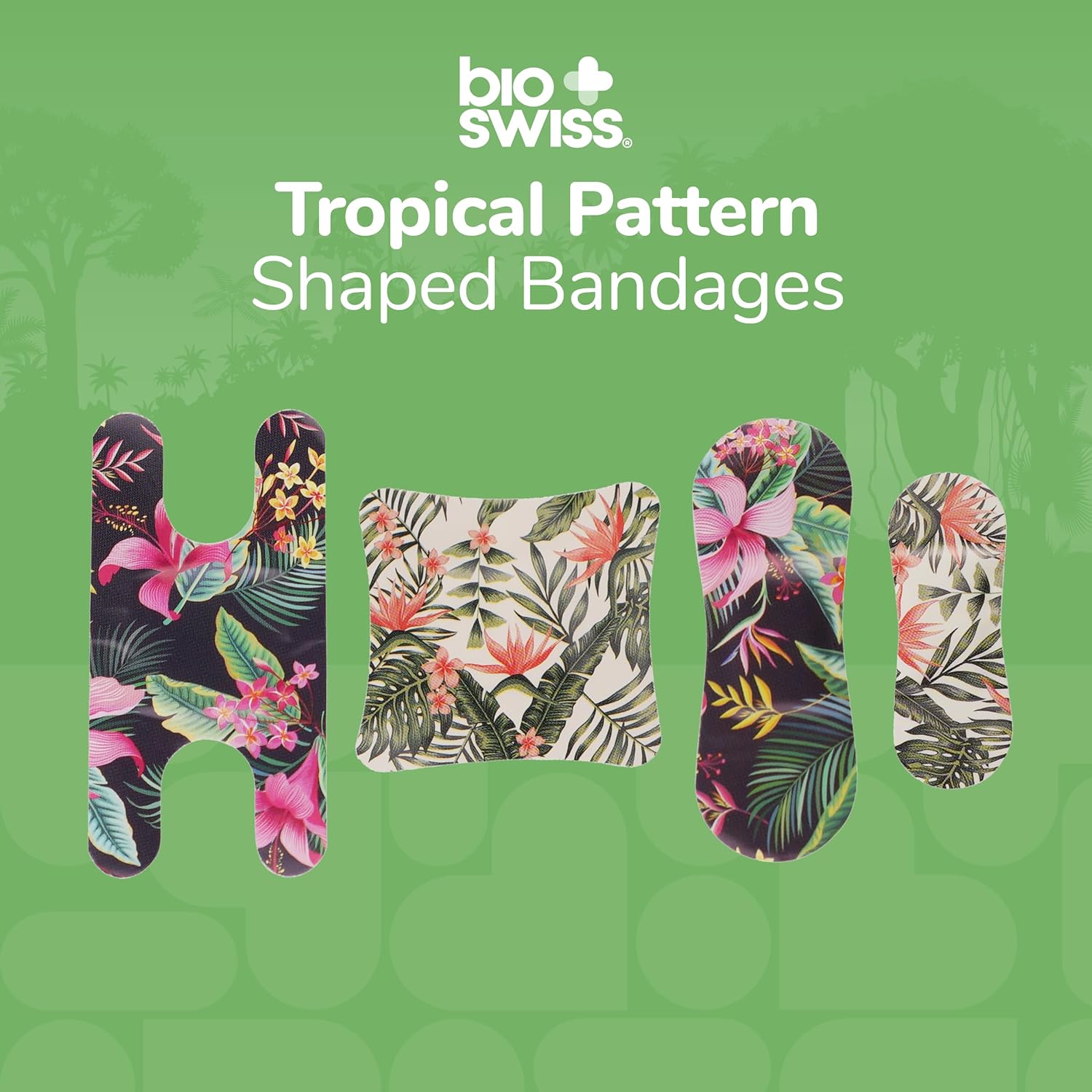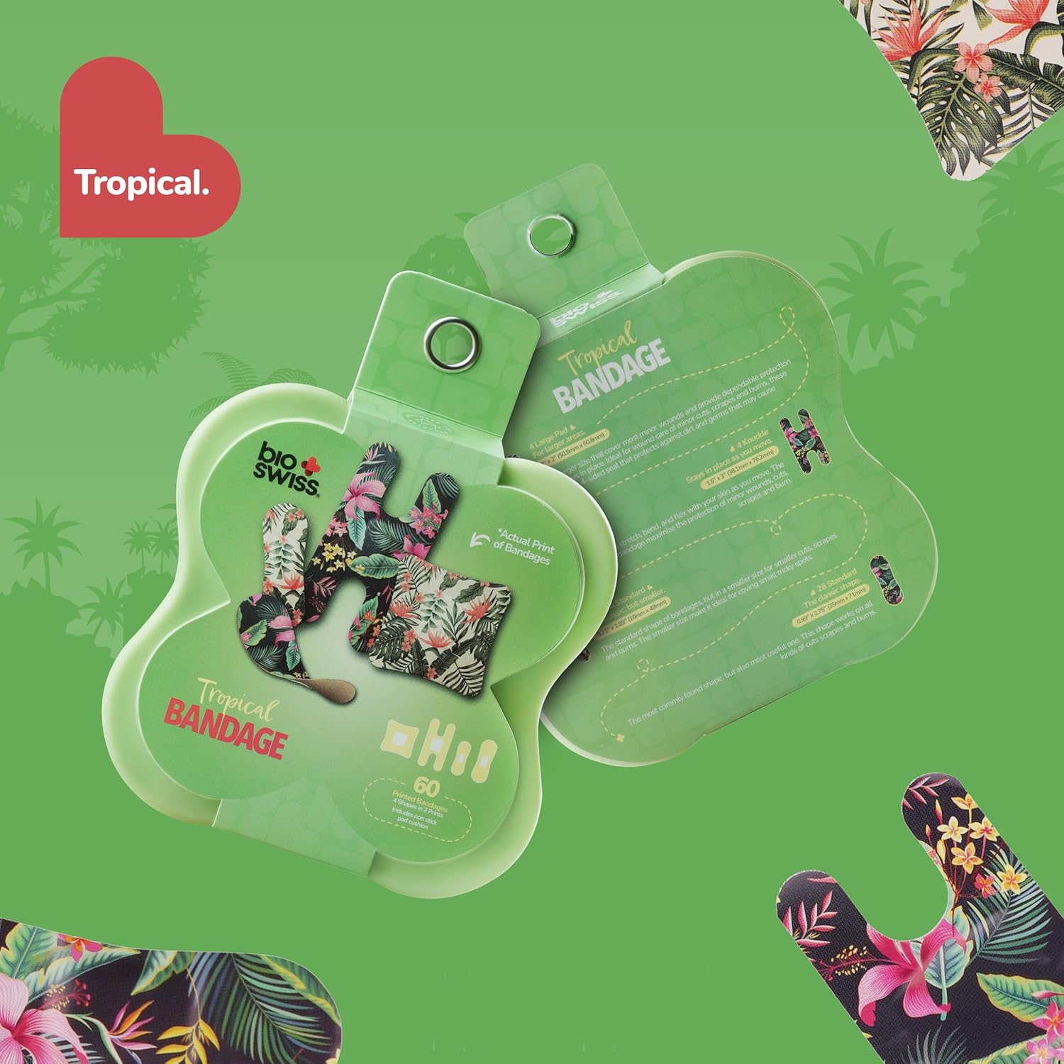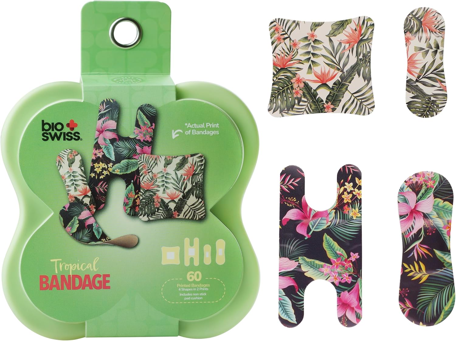 BioSwiss Bandages, Assorted Size Tropical Print Self Adhesive Bandage, Latex Free Sterile Wound Care, First Aid Kit Supplies for Kids and Adults, 60 Count