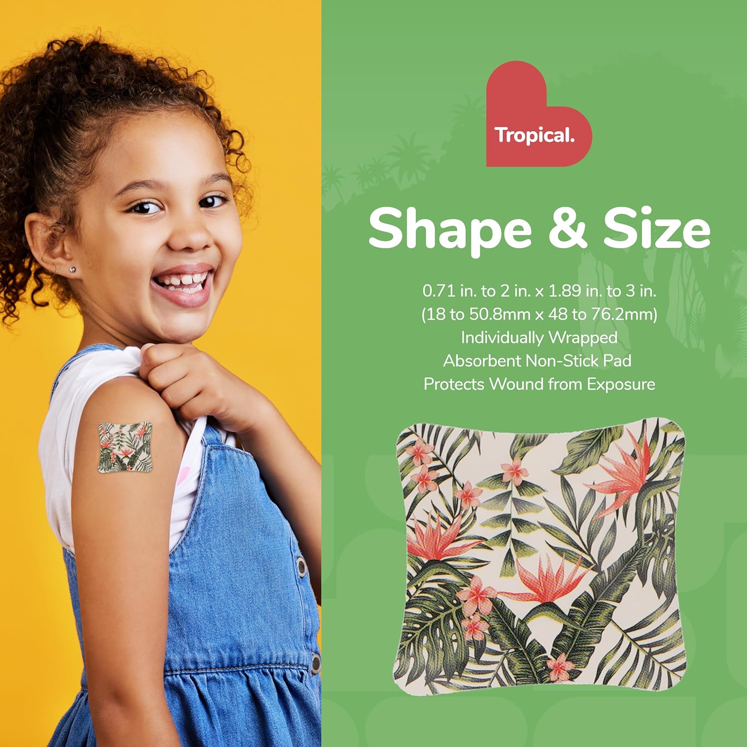 - ASSORTED SIZE BANDAGES: This 60 piece pack of tropial print bandages features a variety of sizes; 4 large pads measuring 2 inches by 2 inches, 4 knuckle bandages designed to stay in place as you move measuring 1.5 inches by 3 inches, 26 small standard bandages measuring 0.71 inches by 1.89 inches, and 26 standard bandages measuring 0.99 inches by 2.75 inches; each bandage has its own unique pattern