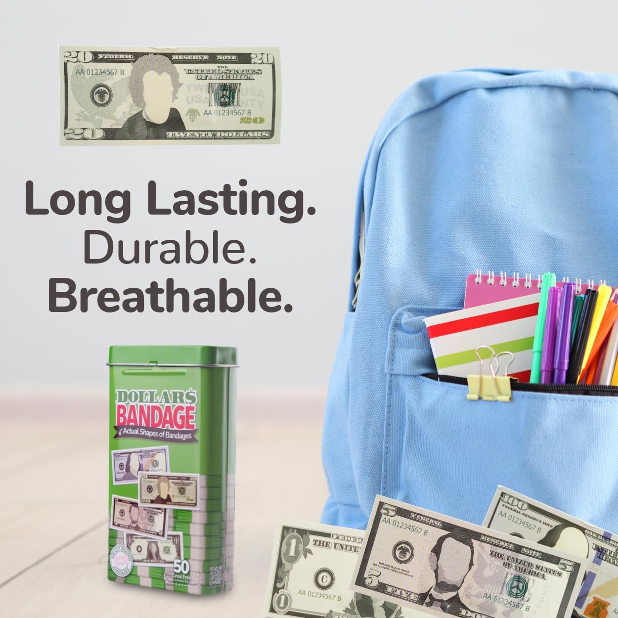 - MONEY BANDAGES: This 50 piece pack of adorable dollar bill shaped bandages is great for putting a smile on kids' faces while protecting wounds such as cuts, scrapes, and burns; sticky bandages are perfect for kids and adults alike, and also for school nurses and pediatric doctors