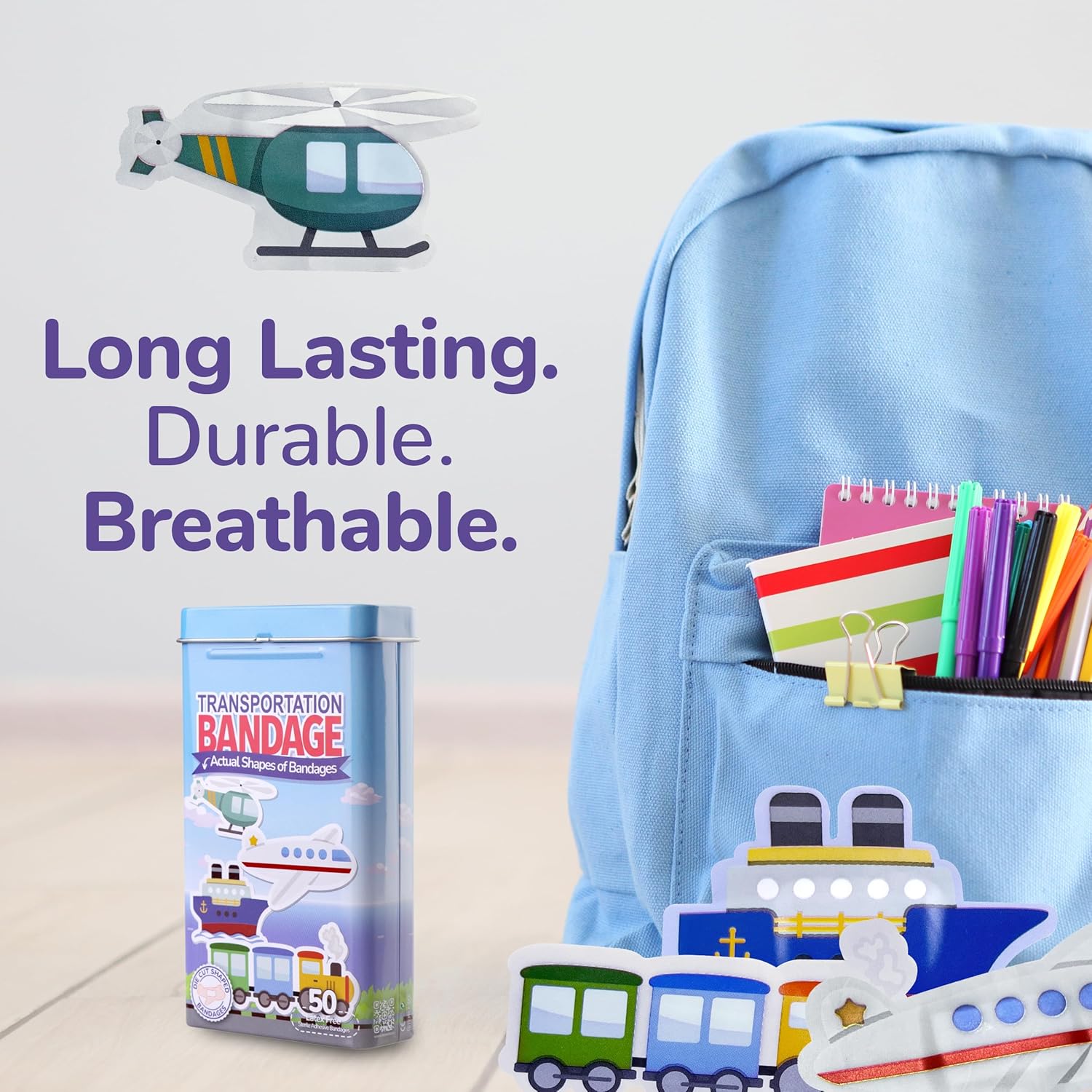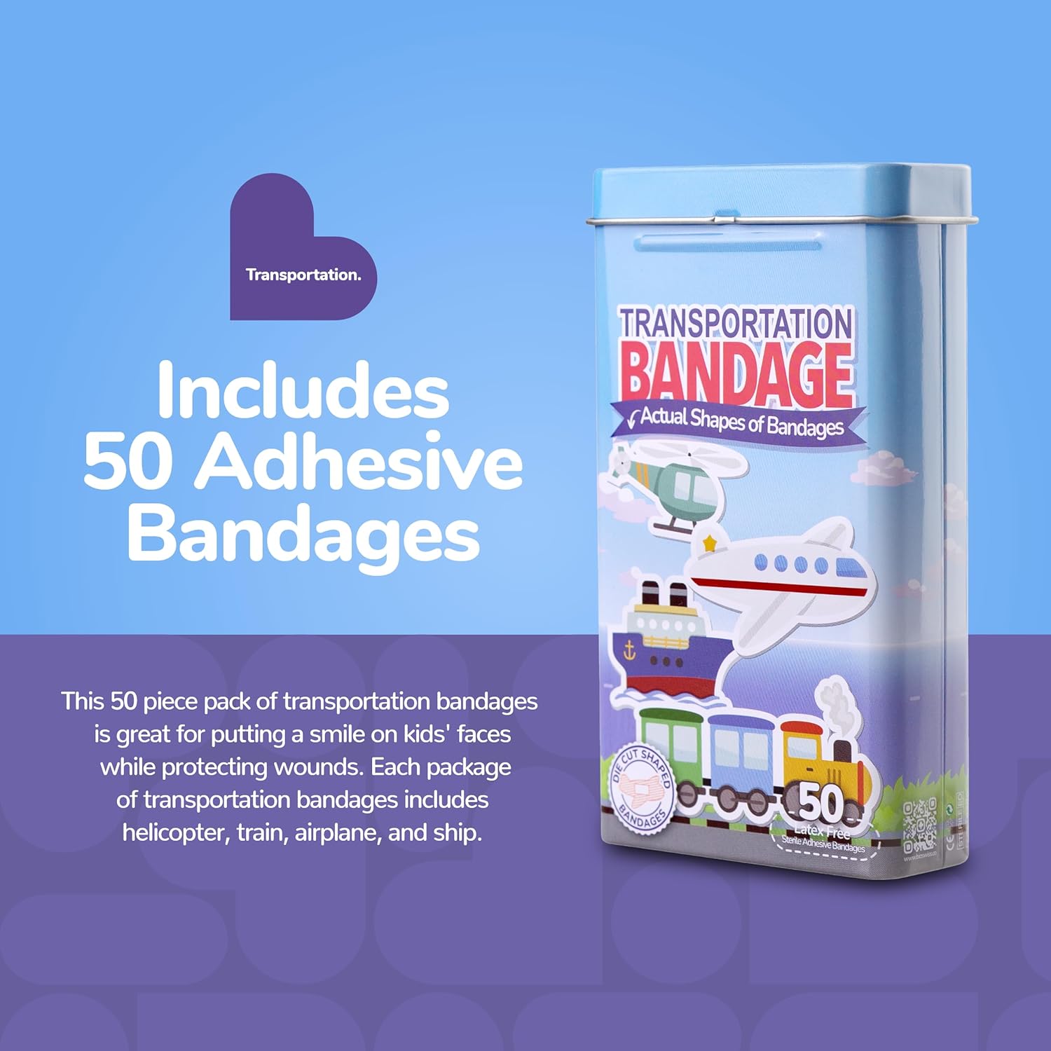 - TRANSPORTATION BANDAGES: This 50 piece pack of adorable vehicle shaped bandages is great for putting a smile on kids' faces while protecting wounds such as cuts, scrapes, and burns and comes in an assortment of boat, airplane, train, and helicopter shapes; sticky bandages are perfect for kids and adults alike, and also for school nurses and pediatric doctors