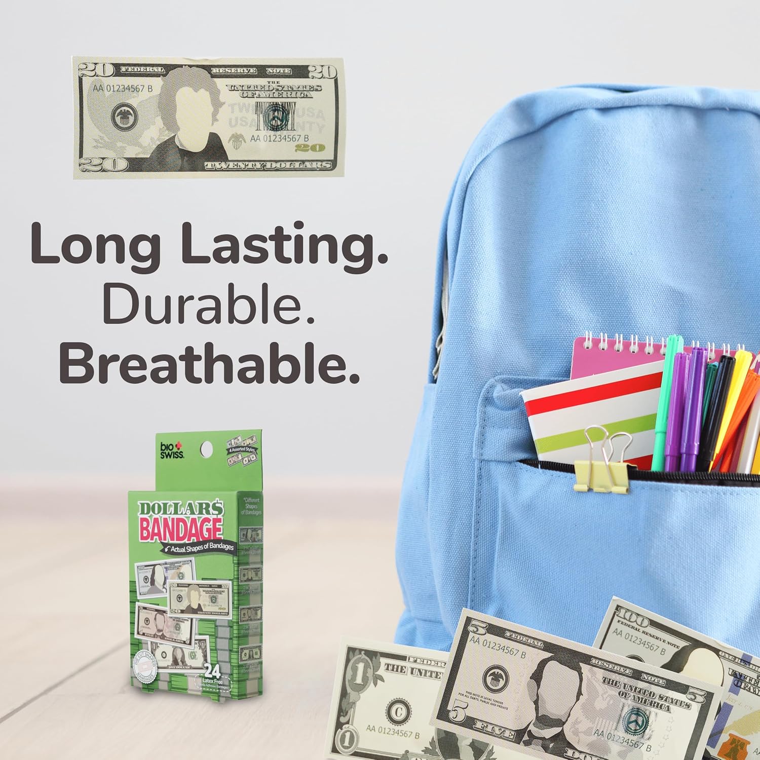 - MONEY BANDAGES: This 24 piece pack of adorable dollar bill shaped bandages is great for putting a smile on kids' faces while protecting wounds such as cuts, scrapes, and burns; sticky bandages are perfect for kids and adults alike, and also for school nurses and pediatric doctors