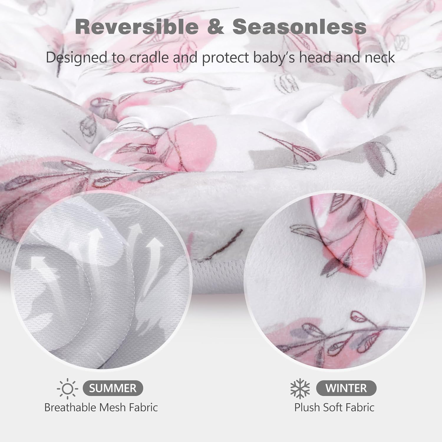 - 【Reversible & All-Season Design】The infant car seat insert is reversible: plush fleece for winter & cooling mesh for summer. Dual-pattern designs keep your car seat head support stylish and functional year-round!