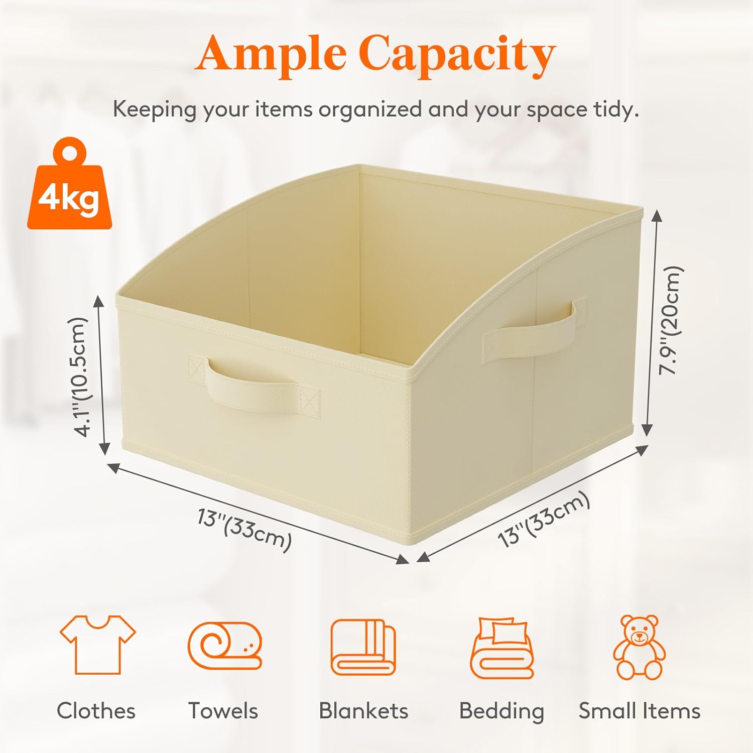 - Spacious Storage: Measuring 13.0“(33 cm) x 13"(33 cm) x 7.9”(20 cm), these closet storage bins offer ample space, ideal for storing clothes, towels, blankets, bedding, hats, toys, and more. They help declutter and organize your space, creating a clean and tidy wardrobe environment.