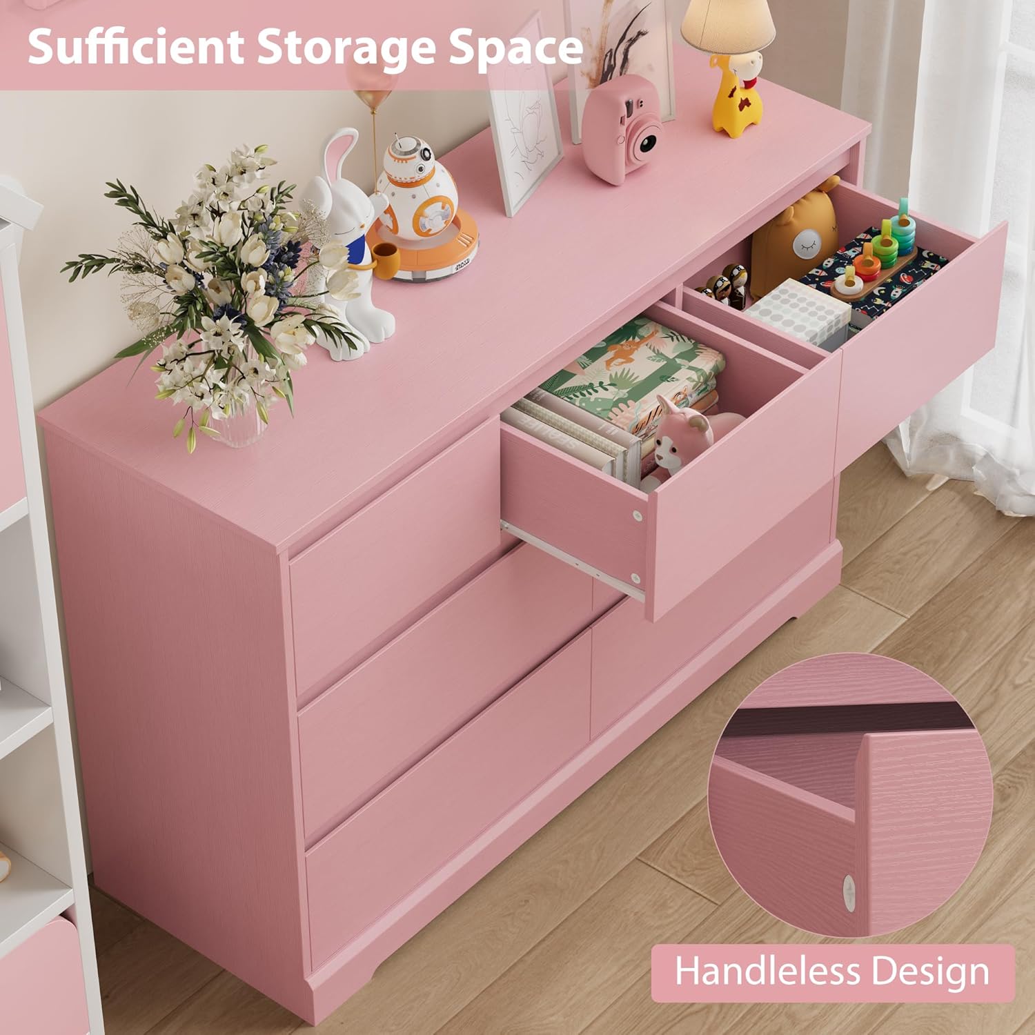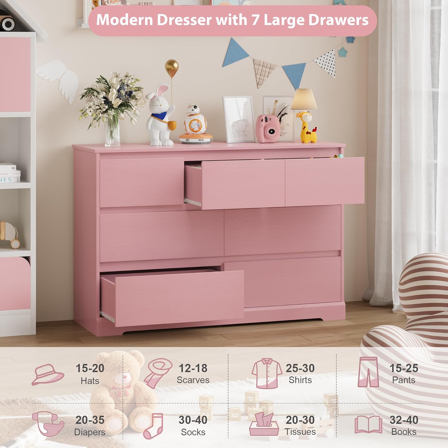 Dresser for Bedroom, Modern Pink Dresser, Wood Chest of Drawers Nursery Dressers, with Storage, 7 Drawer Double with Handle Free, Large Storage Organizer for Living Room,Pink