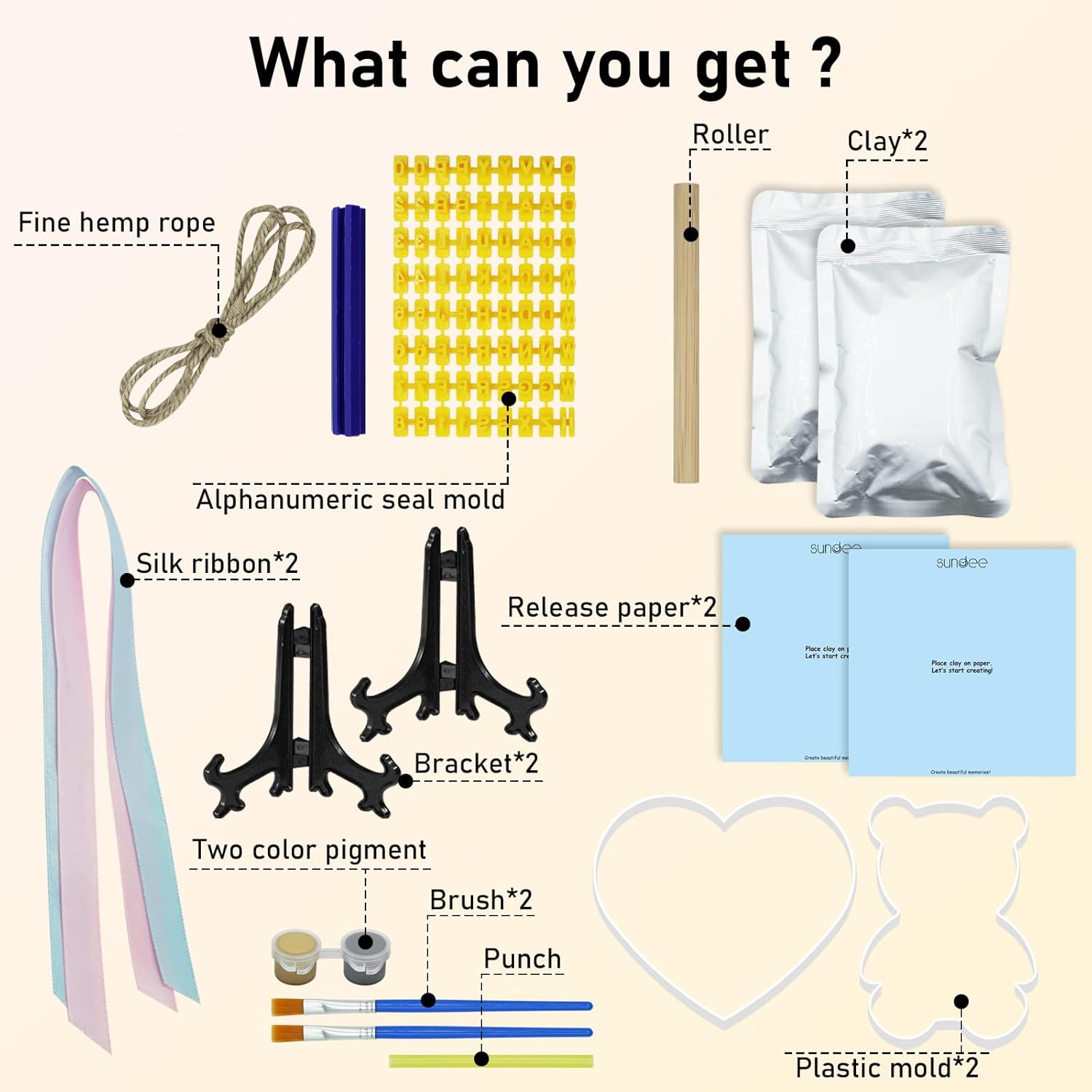 - Set Includes:Two pieces of air dried clay, roller, straw, 2 paint brushes, 2 ribbons, additional custom template kit, 2 display stands, 2 colors of paint.Grey and gold.Everything you need to make beautiful, lasting footprints or paw prints souvenir ornaments to display on your mantel or hang on your Christmas tree.