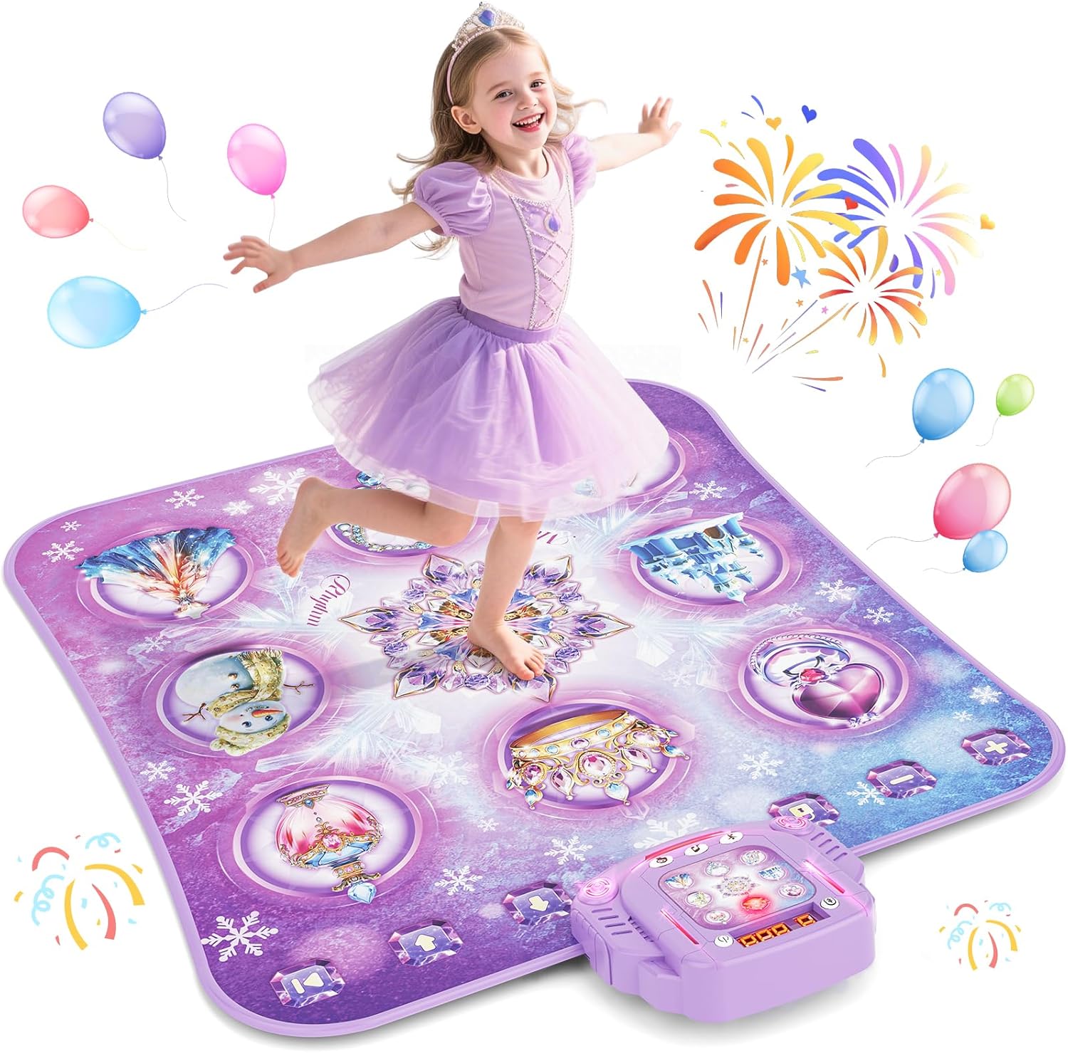 - 【Step on the Princess Dance Mat】let the girl's princess dream bloom on her toes! Handwell fantasy purple dance pad, with the frozen kingdom as the stage, has 8 exclusive fairy tale buttons - crown, castle, snowman, perfume bottle, crystal high heels, princess dress, necklace, ring pattern. Every step is a restart of the fairy tale plot. Little princesses aged 3-12 will dance and grow up in the charming melody, starting an extraordinary dance game adventure