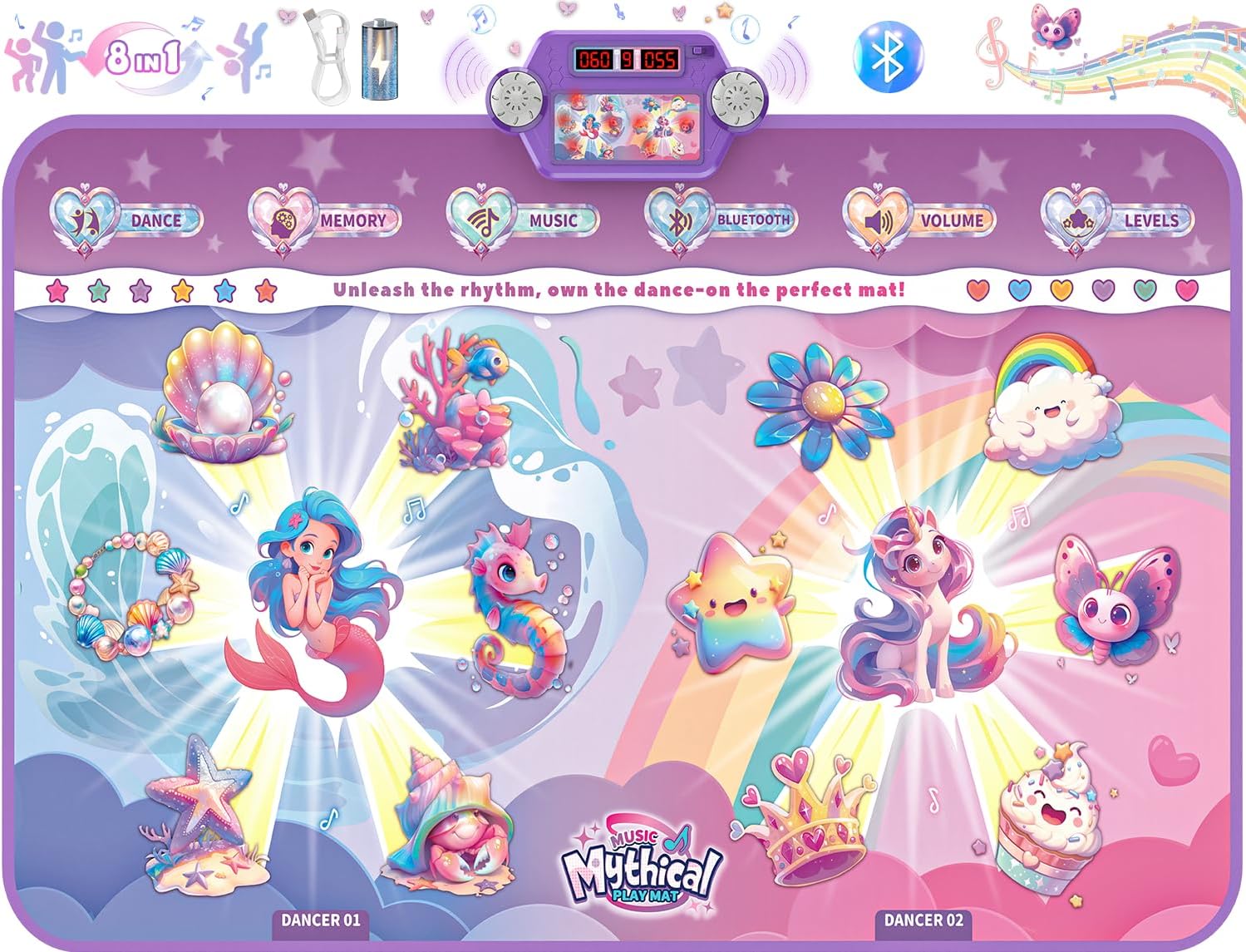 - Spacious & Dreamy Dual-Dance Zones: The largest dance mat (150×90 cm) features dual fantasy themes—Unicorn Dreamland & Mermaid Ocean City—with 12 keys shaped as stars, rainbows, ice cream, butterflies, and sea creatures. Its extra-large width fits 2-3 players for dance battles challenge or band performances, suitable for ages 3+ to adults.