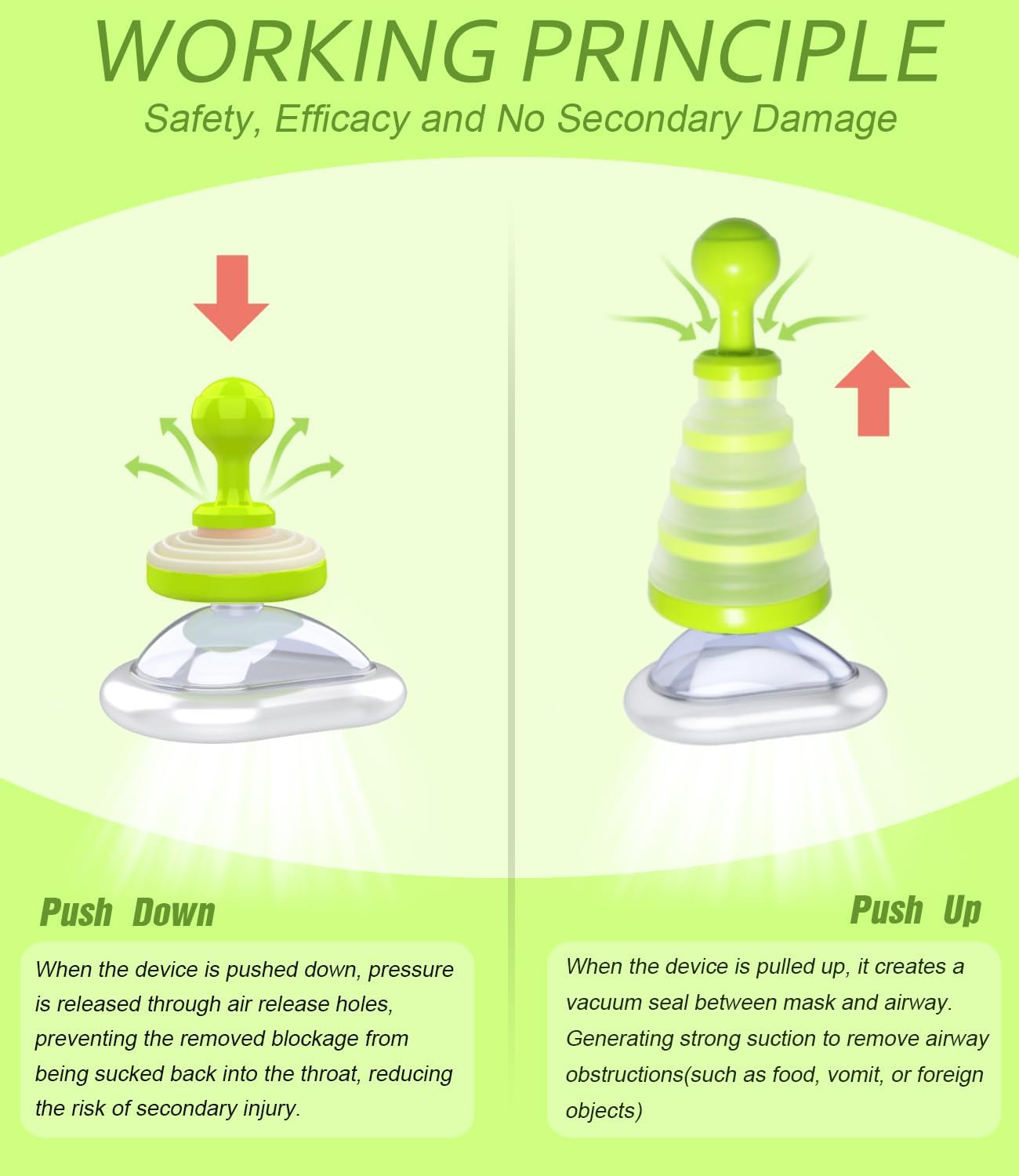 - Dual Protection Design --- The choking suction device adopts double-valve design which separating the exhaust valve from the intake valve, avoiding foreign objects being pressed deeper into the airway during resuscitation and providing you with a safer experience.