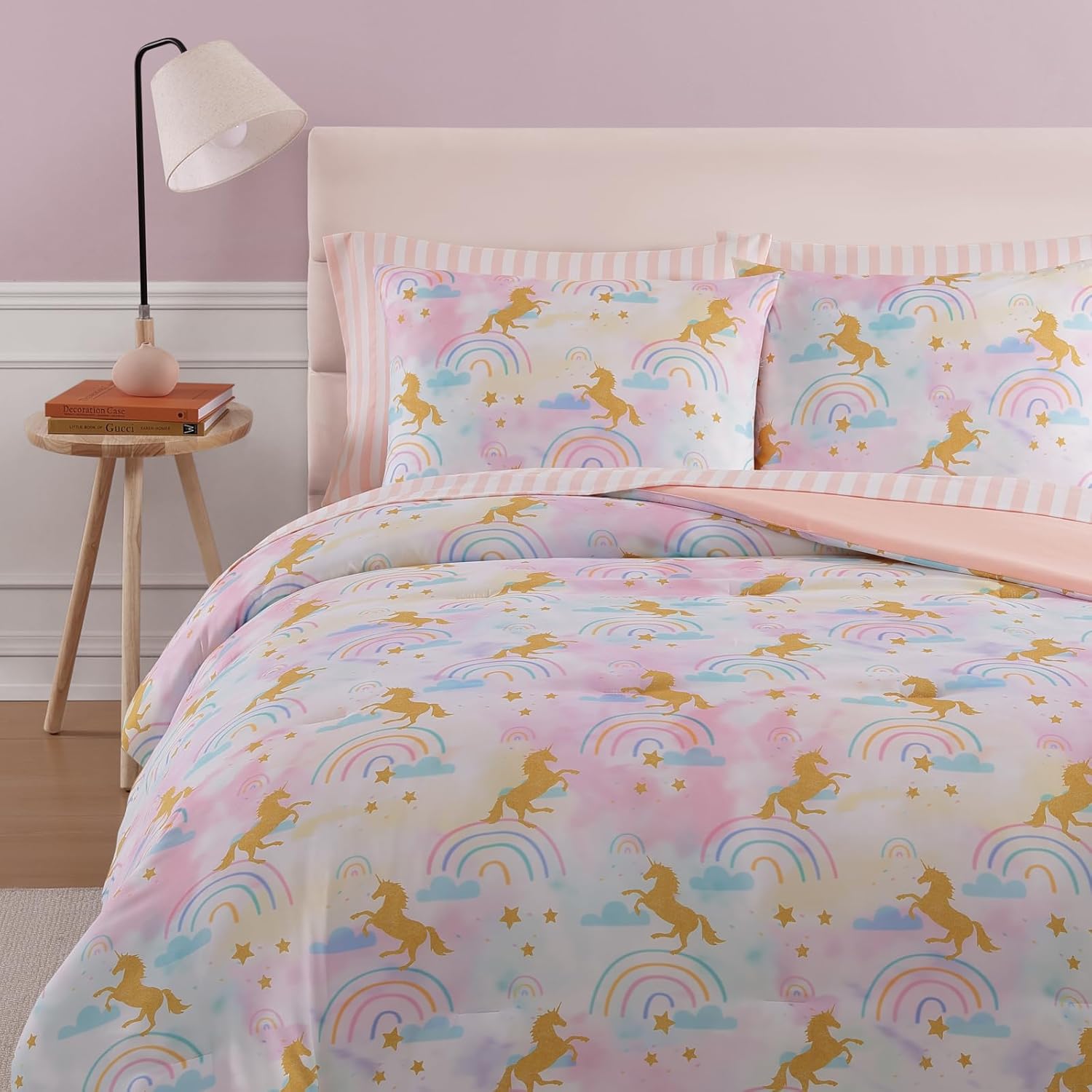 Twin Comforter Set with Sheets for Girls-5 Pieces Twin Bedding Sets with Pink Comforter, Sheets, Pillowcase & Sham for Kids (Gold Unicorn, 66" X 86")